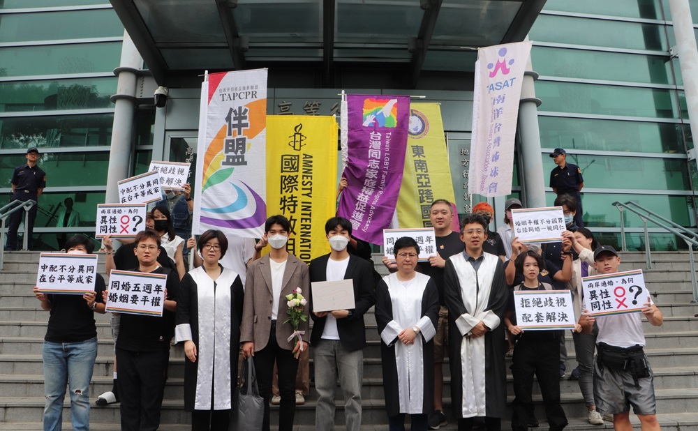 台灣同婚通過正值五週年,然而台灣與中國籍同性伴侶仍無法在台結婚,為了推動兩岸同婚,台灣伴侶權益推動聯盟(下稱:伴盟)與國際特赦組織台灣分會共同合作,至今已陸續啟動了五個影響性訴訟,其中Alvin(台灣籍)與Jim(中國籍)要求結婚登記一案,於今日(5/22)於台北高等行政法院召開第一次準備程序庭,聲援團體集結在法院外,呼籲新政府不應再放任行政機關怠惰,逼迫人民一再上法院,浪費公帑也勞民傷財,應儘速還給兩岸同性伴侶平等結婚的權利。